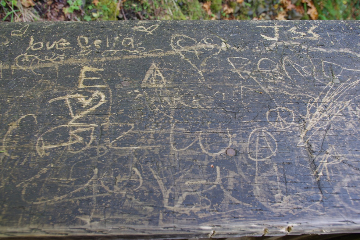 Tangent: On the platform looking out at Bridal Veil Falls, I saw these carvings on the wood railings. These declarations of love are very common, and they showcase two things: 1) vandalism is prevalent, 2) only naive, immature people believe in love enough to put it on wood and stone. The rest of the world doesn't even bother to lie no more.